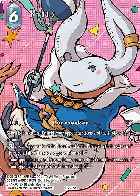 Hurry! Only0units left in stock!Set Name: Emissaries of Light Card Number: 16-037R Release Date: 2022-04-15 Rarity: Rare Card Type: Backup Element: Ice Cost: 6 Job: Runeseeker Categories: FFTA When Babus enters the field, your opponent selects 2 of the 4 following